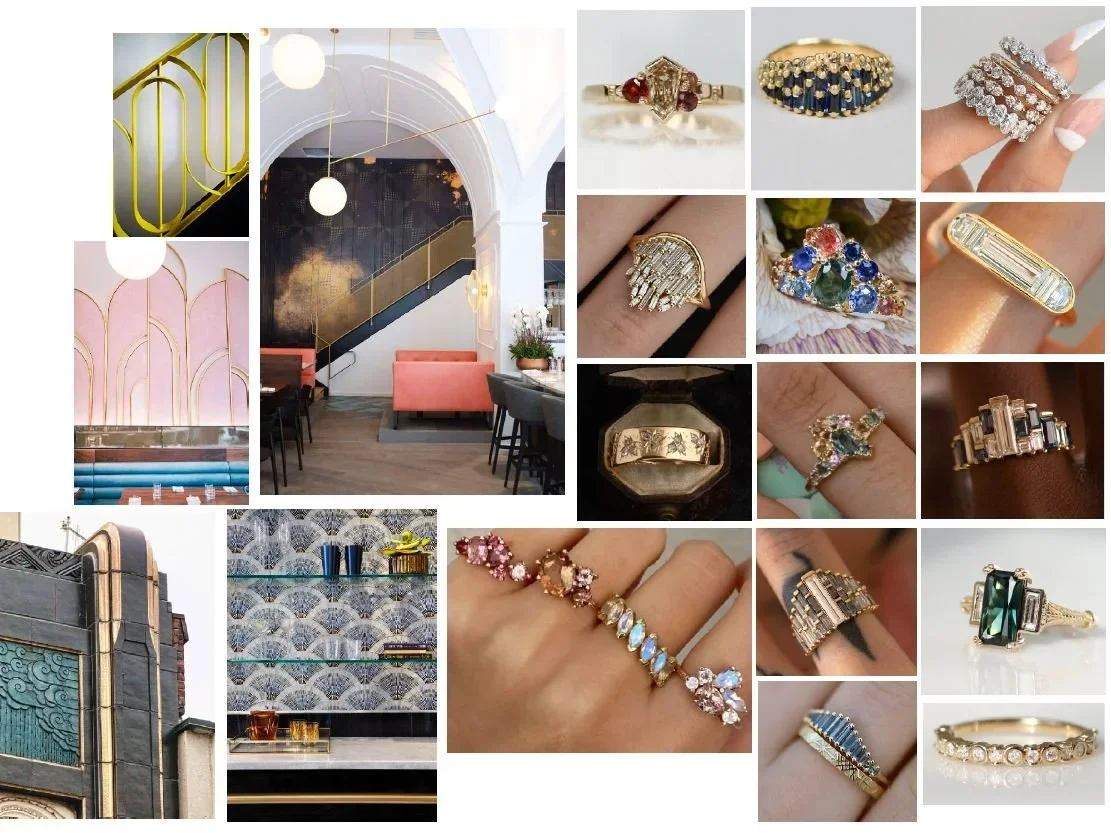 As with most of my clients, I asked her to put together a mood board for me and she did not disappoint! Her board exuded a luxurious richness and a bold, eclectic vibe. It was paired with vintage details and an art deco decadence. My design goals were to take all of that and morph them into an everyday ring using Carly’s heirloom sapphires. Continue on to see the journey of this heirloom revival piece!
