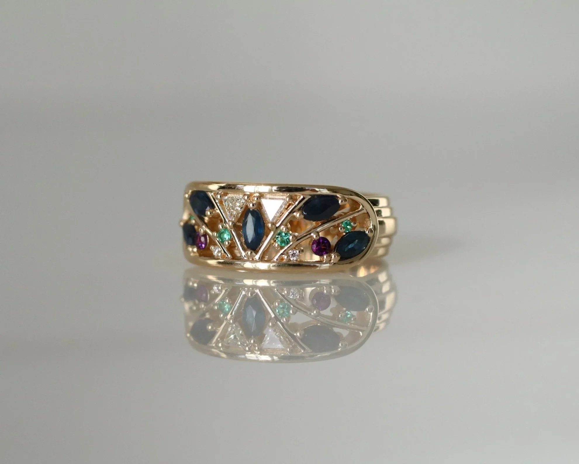 Another element that really struck me about Carly’s mood board was the explosion of color; especially some of the jewel tones. We had the one color with her grandmother’s deep blue sapphires, but it needed more. Once I added in the emeralds and amethysts, it was * chef’s kiss * perfection.