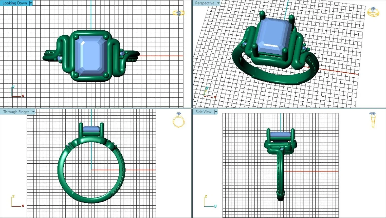 The all green renders show what design is used for production while the more realistic renders (below) is what I showed Leslie. You can see in the more technical one that elements like the prongs are left taller so that once the piece is in metal, my production team and I have the necessary parts to realistically finish it.