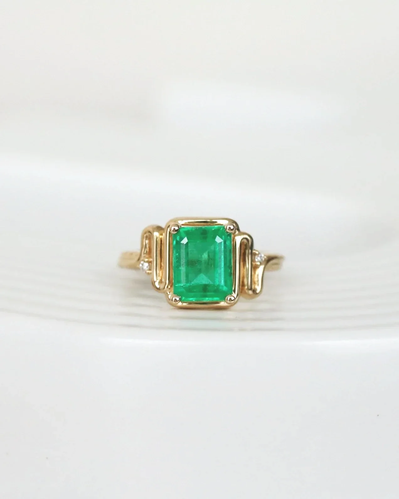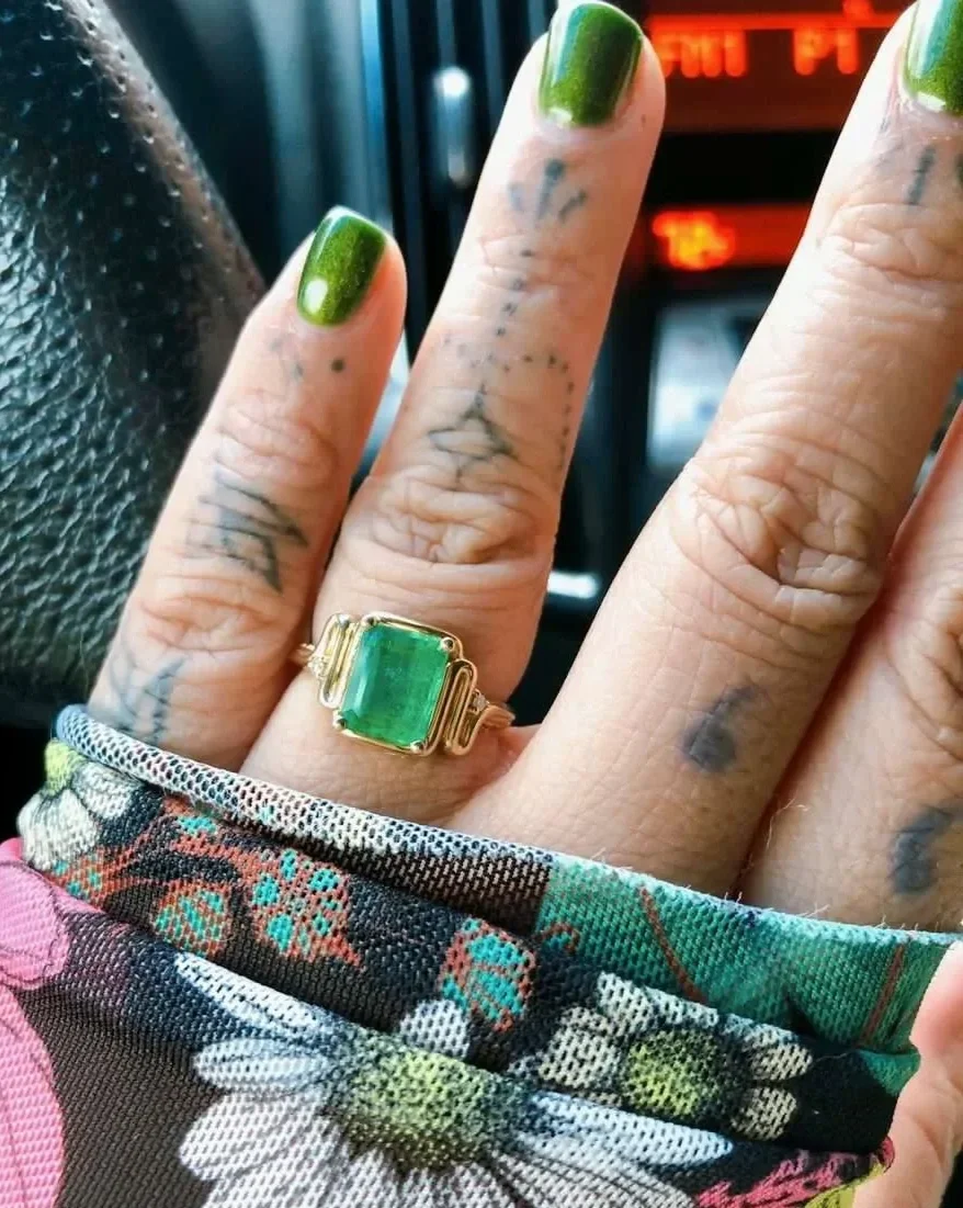 This month, I’m highlighting Leslie’s extraordinary, emerald and yellow gold engagement ring.